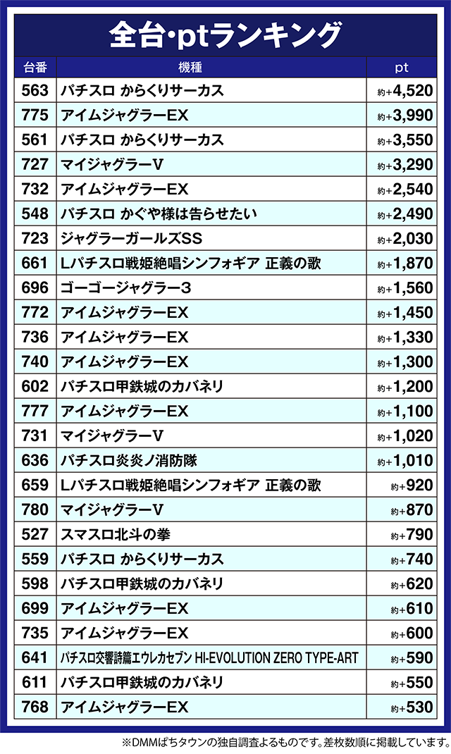 ジャグラーシリーズ以外では、「パチスロ かぐや様は告らせたい」の548番台や「Lパチスロ戦姫絶唱シンフォギア 正義の歌」の661番台が約+1,800ptを超えた。