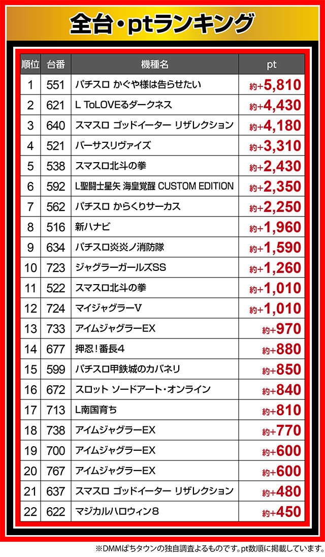 最新機種が盛り上がり、『パチスロ かぐや様は告らせたい』の551番台が約+5,810pt!