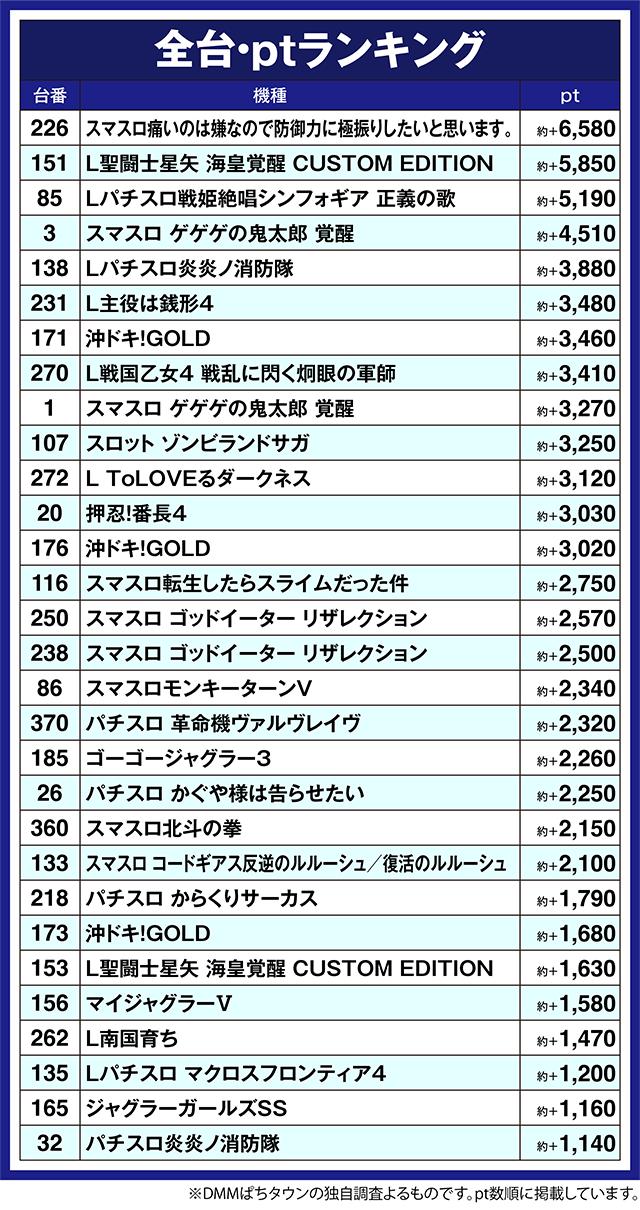 ほかにも、「スマスロ ゲゲゲの鬼太郎 覚醒」の3番台や「Lパチスロ炎炎ノ消防隊」の138番台など、多くの台が約+3,000ptを上回った。