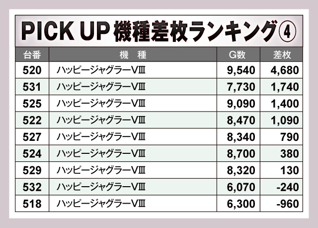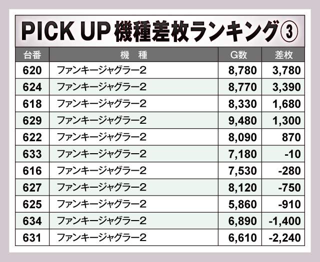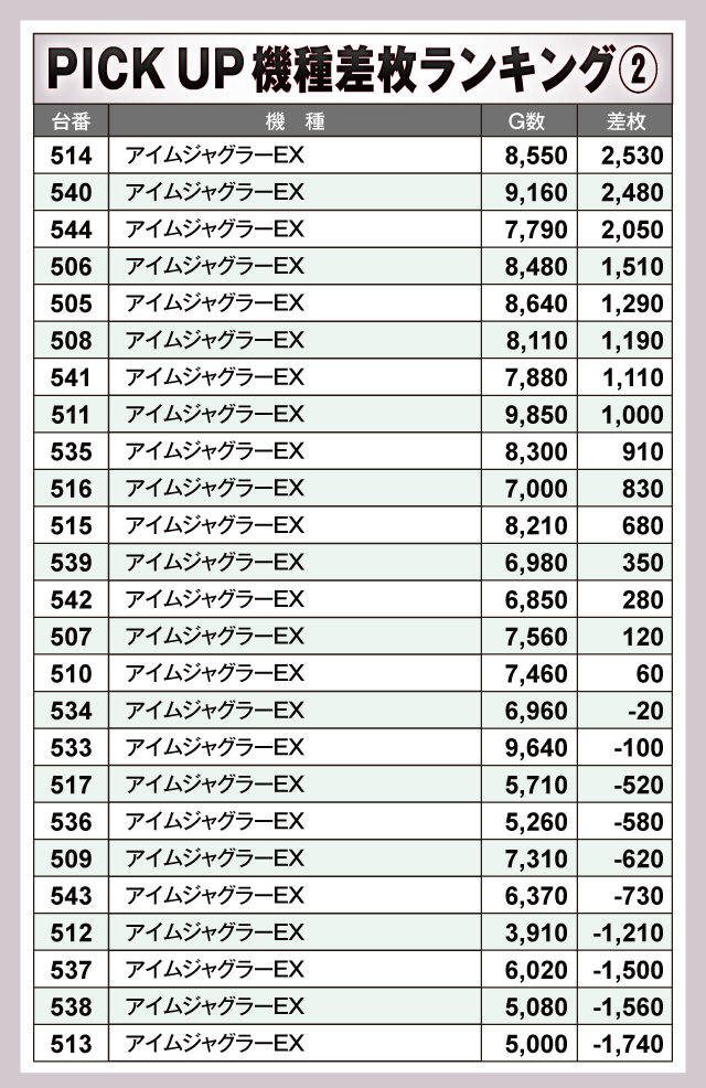 次に、ピックアップ機種の状況を見てみると、お店の看板機種とも言える『マイジャグラーⅤ』では+4,000枚超が3台、『アイムジャグラーEX』は半数以上の台がプラス域で終了している。