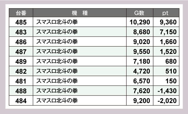 今回またしても注目を集めていたのが、スマスロで設置台数の最も多い『スマスロ北斗の拳』だ。9台中7台がプラス差枚となっており、なかでも485番台は万枚一歩手前の活躍ぶりだった。