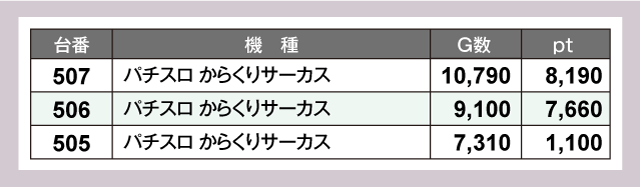 『パチスロ からくりサーカス』は平均9,000G回されるなど終日フル稼働。平均+5,650ptと素晴らしい結果を残している。