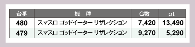 『スマスロ ゴッドイーター リザレクション』は480番台13,000ptオーバー、479番台5,000ptオーバーと凄まじい破壊力を見せていた。