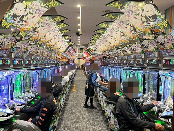 15時半ごろの4円パチンコを見渡すと「P宇宙戦艦ヤマト2202 超波動」や「e Re:ゼロから始める異世界生活 season2」の盛り上がりが大きい。プレイヤーの活躍を各所で目にしている。