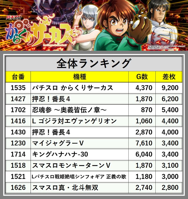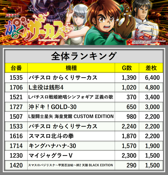 厳選された取材対象機種をはじめ、その他スロット全体から好記録が飛び出した!プレイヤーが楽しんだ1日を下記データにて振り返ってみて欲しい。