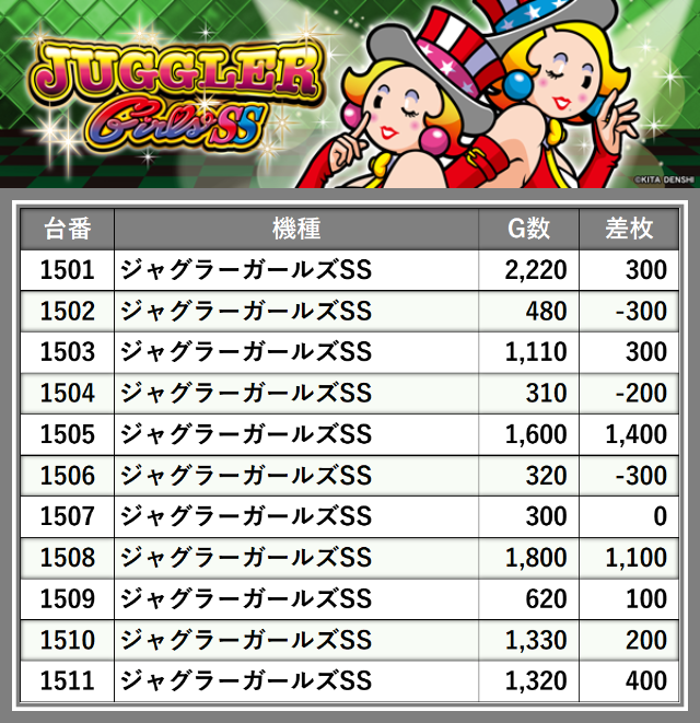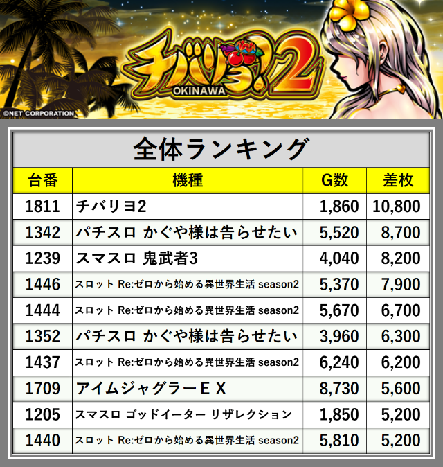 厳選された取材対象機種をはじめ、その他スロット全体から好記録が飛び出した!プレイヤーが楽しんだ1日を下記データにて振り返ってみて欲しい。