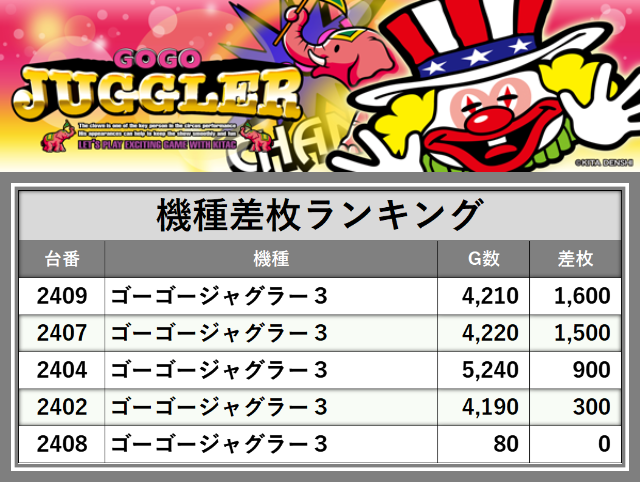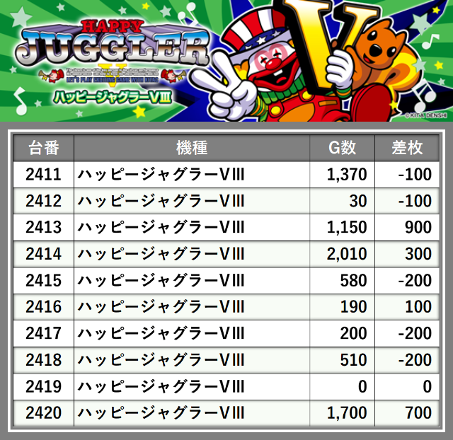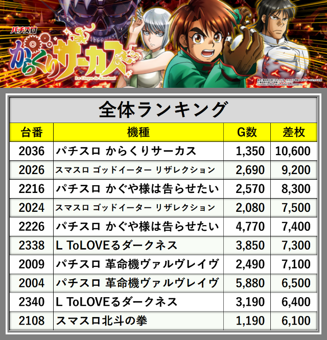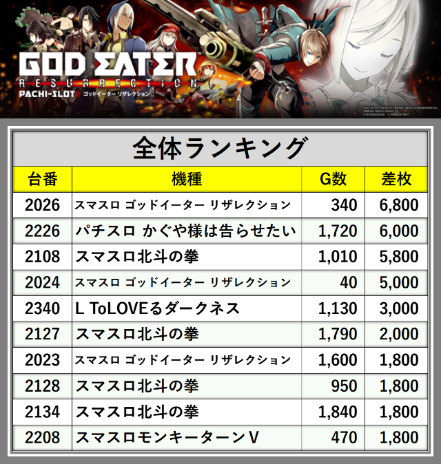 厳選された取材対象機種をはじめ、その他スロット全体から好記録が飛び出した!プレイヤーが楽しんだ1日を下記データにて振り返ってみて欲しい。