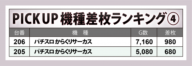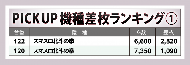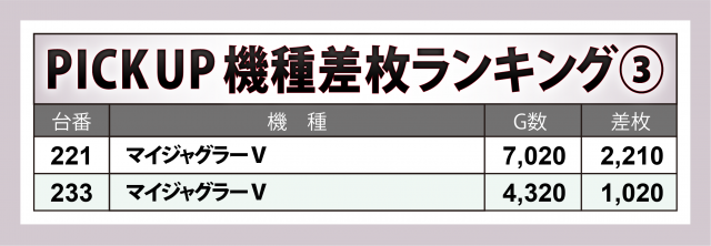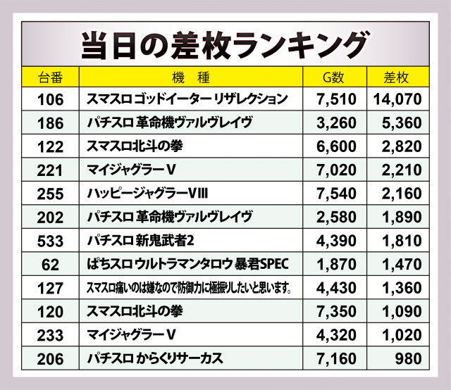 まずは上位12台の成績から。うち11台が+1,000枚以上を成し遂げ、+2,000枚以上は5台、+5,000枚オーバーは2台、そして万枚をクリアしたのは1台となった。