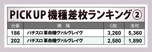 差枚数の多い順から挙げていくと、『パチスロ 革命機ヴァルヴレイヴ』の+5,400枚弱、『スマスロ北斗の拳』の+2,800枚超、『マイジャグラーⅤ』の+2,200枚超と、定番人気のマシンが実績を残した。