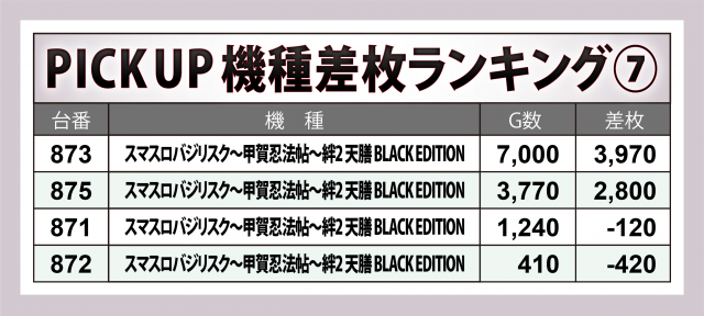また次項で述べる7機種以外の好調台としては、『押忍!番長4』の+8,300枚超、『スマスロ ゴッドイーター リザレクション』の+5,800枚超、『Lパチスロ戦姫絶唱シンフォギア 正義の歌』の+5,600枚弱、『沖ドキ!BLACK』の+4,600枚超と、他店でも人気の高い機種が実力を発揮した。