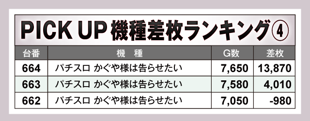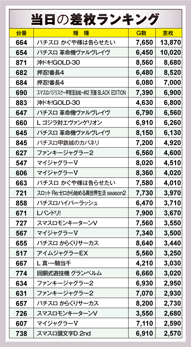 この日は人気のスマスロを中心に+3,000枚超の好調台を大量に確認できた。そんな中、『パチスロ かぐや様は告らせたい』と『パチスロ 革命機ヴァルヴレイヴ』が万枚超を達成しプレイヤーの注目を集めていた。次いで、『沖ドキ!GOLD-30』と『押忍!番長4』が+8,000枚超を記録、ランキング上位は実にハイレベルな結果を残している。
