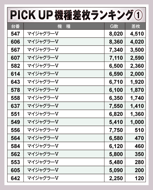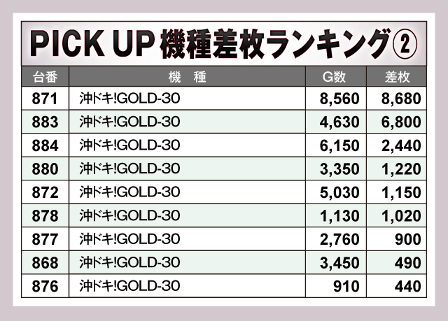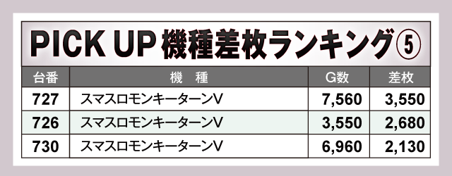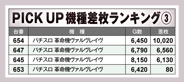 次にPICK UP機種チェックすると、お店の看板機種である『マイジャグラーⅤ』は2台発生している+4,000枚超を筆頭に約半数の台がプラス差枚、さらに『沖ドキ!GOLD-30』は全10台中9台がプラスという盛況ぶりを見せていた。また、万枚超を叩き出した『パチスロ 革命機ヴァルヴレイヴ』は他にも+6,000枚超が2台も発生している。