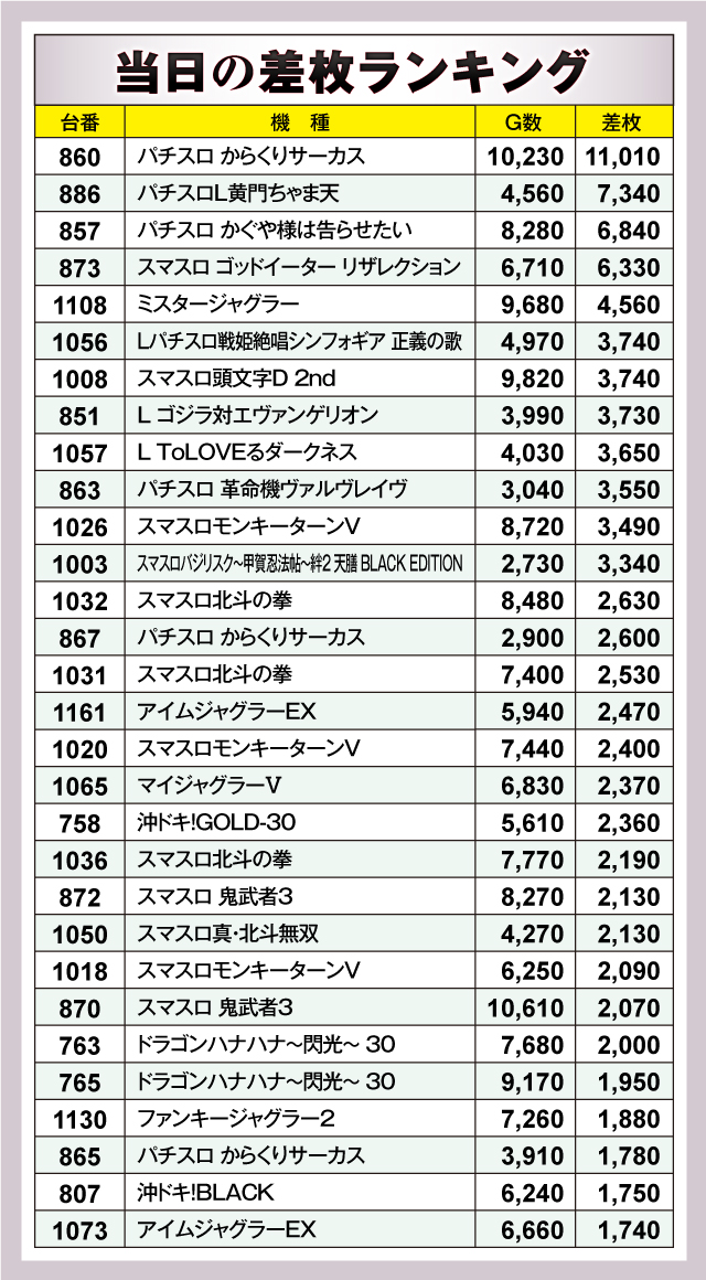 優秀台、ピックアップ機種ともに好調で、大台を突破した台を筆頭に、ランキングトップ30台のうち25台が+2,000枚オーバーを記録しており、多くの英雄が生まれる結果となった。これだけ実施しても、少しもクオリティが落ちていないのはさすが。次回も十分に期待できそうだ。