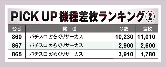 ピックアップ機種では、『スマスロ北斗の拳』が抜群の安定感を見せた。8台中6台がプラスで、うち4台が+1,000枚オーバーだった。『パチスロ からくりサーカス』も素晴らしく、優秀台として紹介した860番台の他に2台が1,000枚オーバーを記録・また、4台中3台がプラスを計上しており、こちらも安定感の高さが光った。