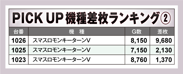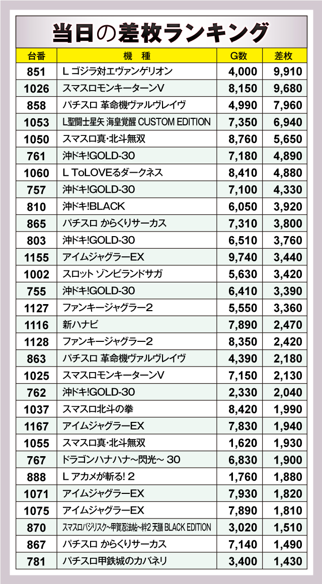 トップ差枚を獲得したのは『L ゴジラ対エヴァンゲリオン』。851番台が+9,910枚と、惜しくも万枚届かずの驚愕の成績を残している。続くのは『スマスロモンキーターンV』。1026番台が、首位とわずか230枚差の+9,680枚で2位に位置した。