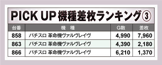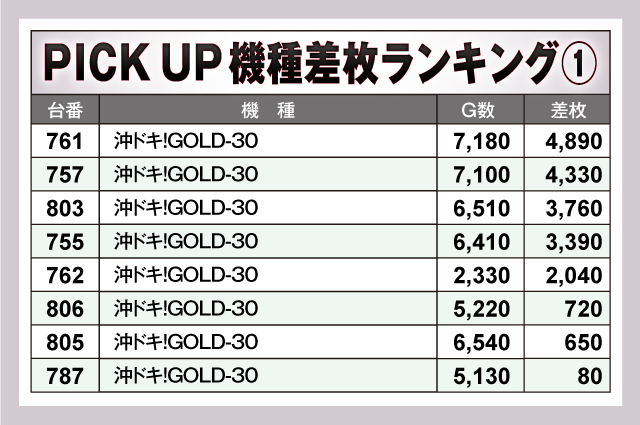 機種ごとにピックアップして見てみよう。同店オススメ機種である『沖ドキ!GOLD-30』は、2,000枚オーバーが5台とすばらしい結果に。とくに761番台は+4,890枚と文句なしの差枚を残している。『スマスロモンキーターンV』は、総合ランキングで2位にくいこんだ1026番台のほかに2台が1,000枚オーバー。『パチスロ 革命機ヴァルヴレイヴ』も、総合で3位の858番台のほかに2台が1,000枚オーバーと同様の結果となった。