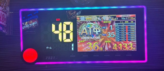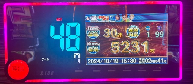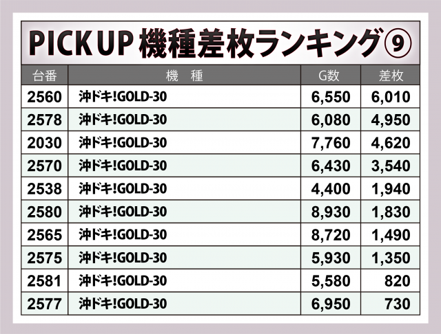 同店では毎度の様に高い差枚数の台がカウントされるのが『沖ドキ!GOLD-30』。+6,000枚超を皮切りに+4,500枚超×2・+3,500枚超と続いた。