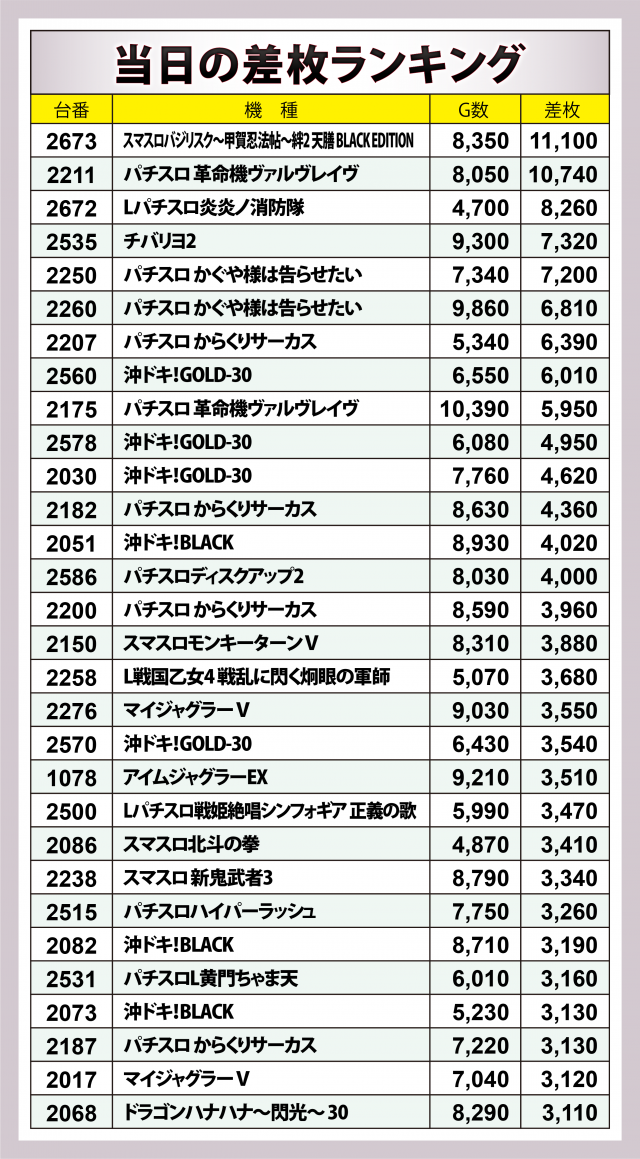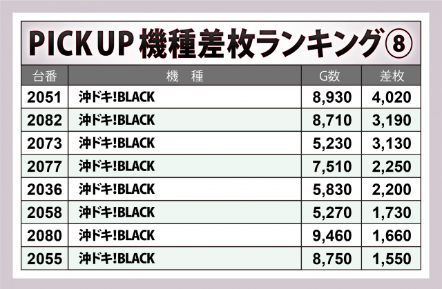 『沖ドキ!BLACK』も上2つに対抗。+4,000枚超を筆頭に、+3,000枚超×2と、こちらも過去回の高水準を維持。