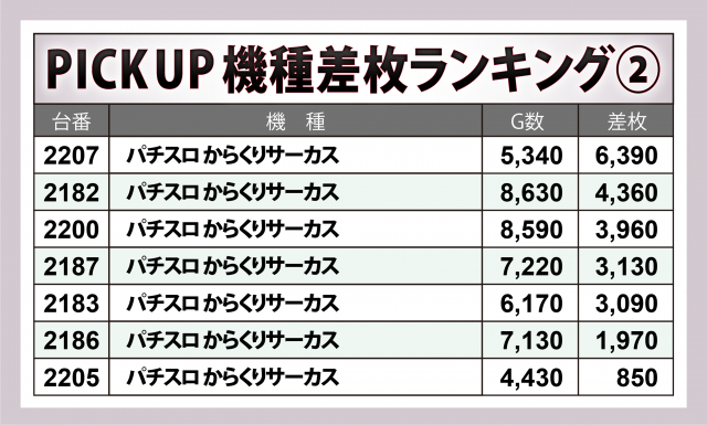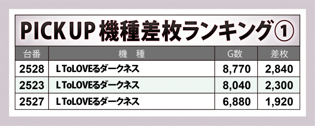 その他では、『Lパチスロ炎炎ノ消防隊』の+8,300枚弱、『チバリヨ2』の+7,300枚超、『パチスロ かぐや様は告らせたい』では+7,200枚超・+6,800枚超が1台ずつ、『パチスロディスクアップ2』の+4,000枚超と、様々なラインナップが好成績を残した。