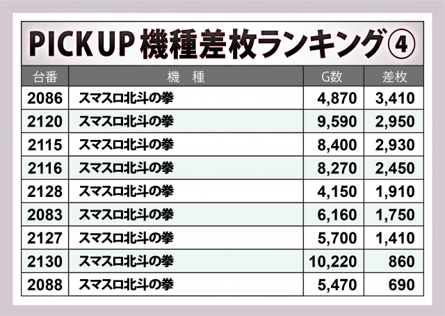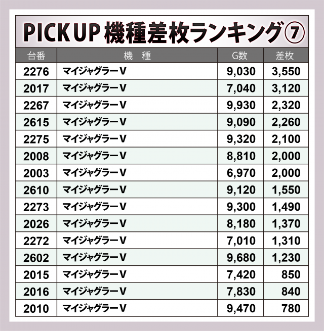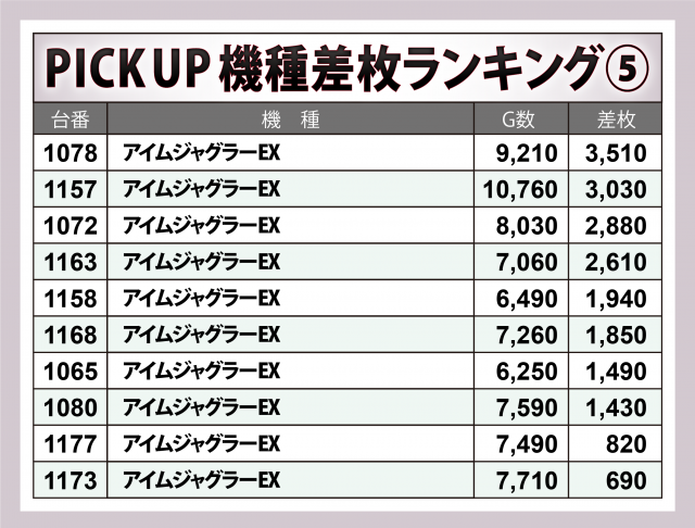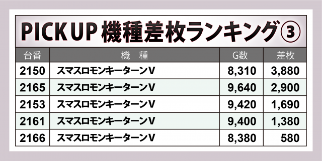 上記に加え、『スマスロモンキーターンⅤ』『マイジャグラーⅤ』『アイムジャグラーEX』『スマスロ北斗の拳』『パチスロハイパーラッシュ』ではいずれも+3,300枚超の台をマークしていた。