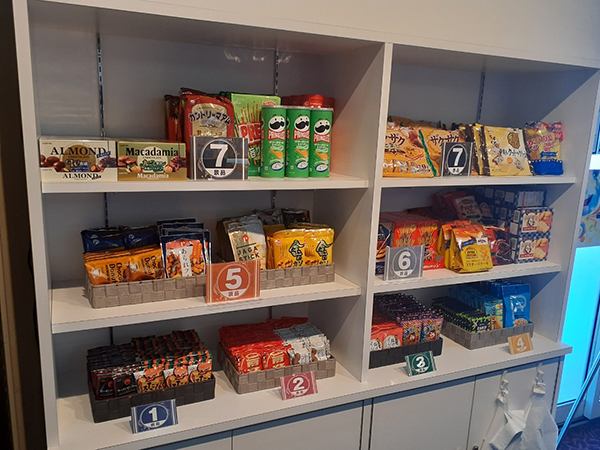景品コーナーには多彩な銘柄のお菓子が用意されており、スナック好きにはたまらない、充実の品揃えとなっている。
