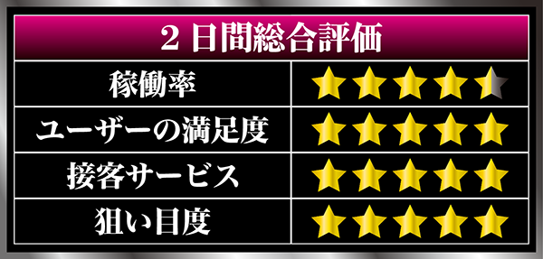 4円パチンコにおいても、「ぱちんこCR真・北斗無双」や「CR ANOTHER牙狼〜炎の刻印〜」など、満席となっている機種が多数。盛り上がりが大きかっただけに、充実感を得られたプレイヤーも多かったように思えた。