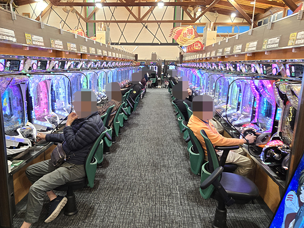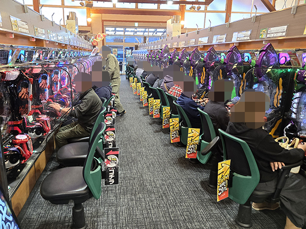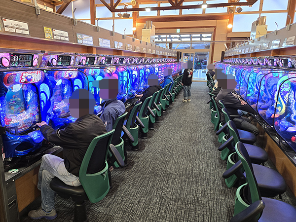 取材時は既に多くのプレイヤーが集結し、パチンコ・パチスロを問わずにぎやかな状況となっていた。