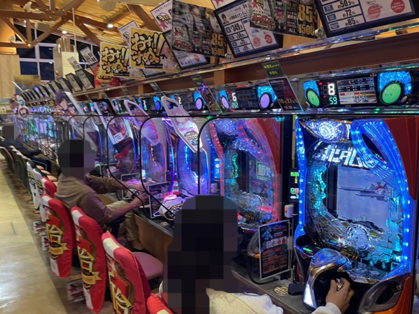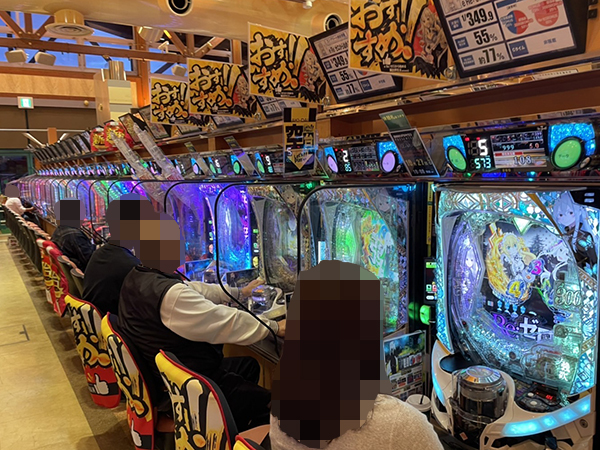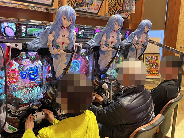 16時ごろの4円パチンコを見ると「e Re:ゼロから始める異世界生活 season2」や「ぱちんこ シン・エヴァンゲリオン Type レイ」が盛況の様子。華麗なパフォーマンスを披露するプレイヤーを多数目撃している。