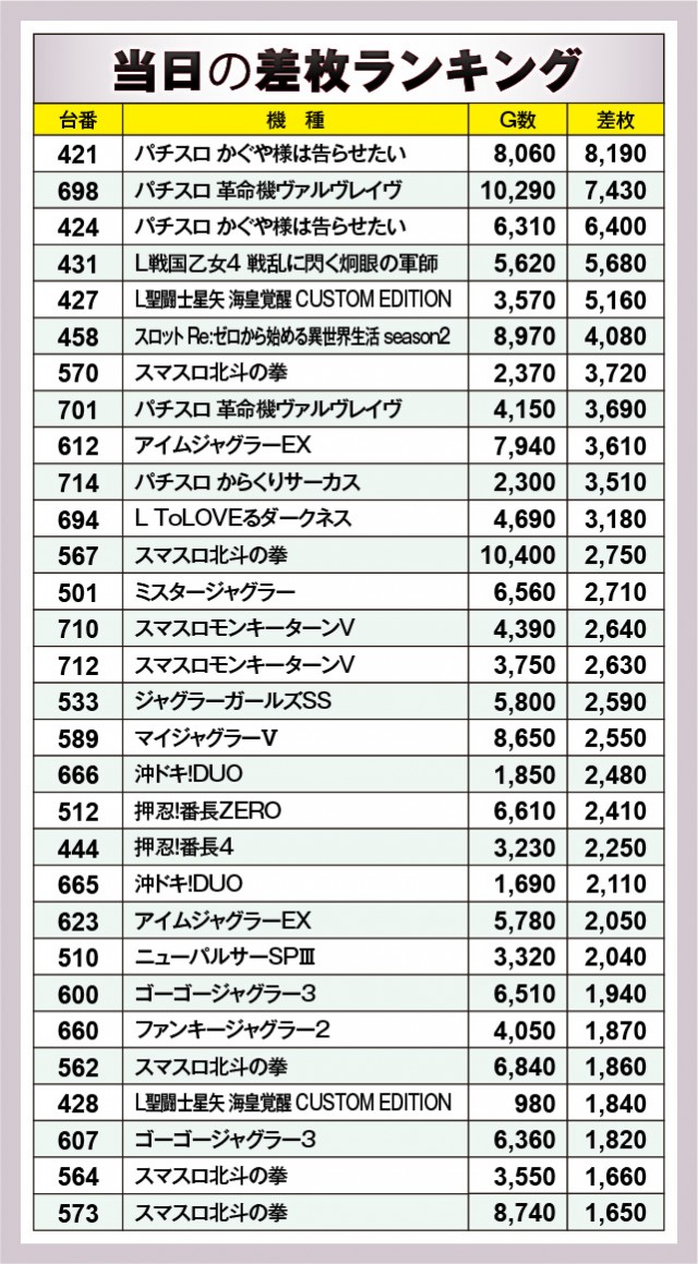 優秀機種の数は10機種となっており、同店がこの日のためにしっかりと準備を進めてきた様子が窺える。その中で『ジャグラー』シリーズの存在感が大きく、右肩上がりのグラフを描く台が多く生まれた。『パチスロ かぐや様は告らせたい』から8,000枚OVER、『パチスロ 革命機ヴァルヴレイヴ』では7,000枚OVERと大きな熱気が放たれた事実も鮮烈で、満足度の高い1日を過ごせたのは間違いない。
