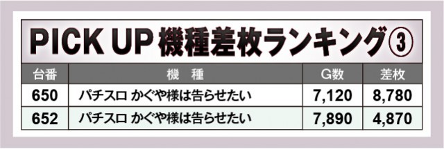 『パチスロ かぐや様は告らせたい』から8,000枚OVERという熱量が発生し、当日の店内の盛り上がりをリードしていた。これに『L ゴジラ対エヴァンゲリオン』が6,000枚OVERと続き、AT機からはまとまった出玉を確保する台が多かったようだ。その一方で『アイムジャグラーEX』が多く名を連ねており、コンスタントなボーナス当選が窺える。じっくりと打ち込まれた形跡も相まって、ファンは好感を覚えていたのは間違いない。