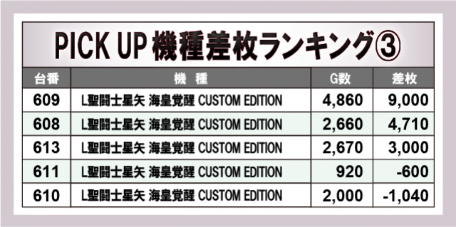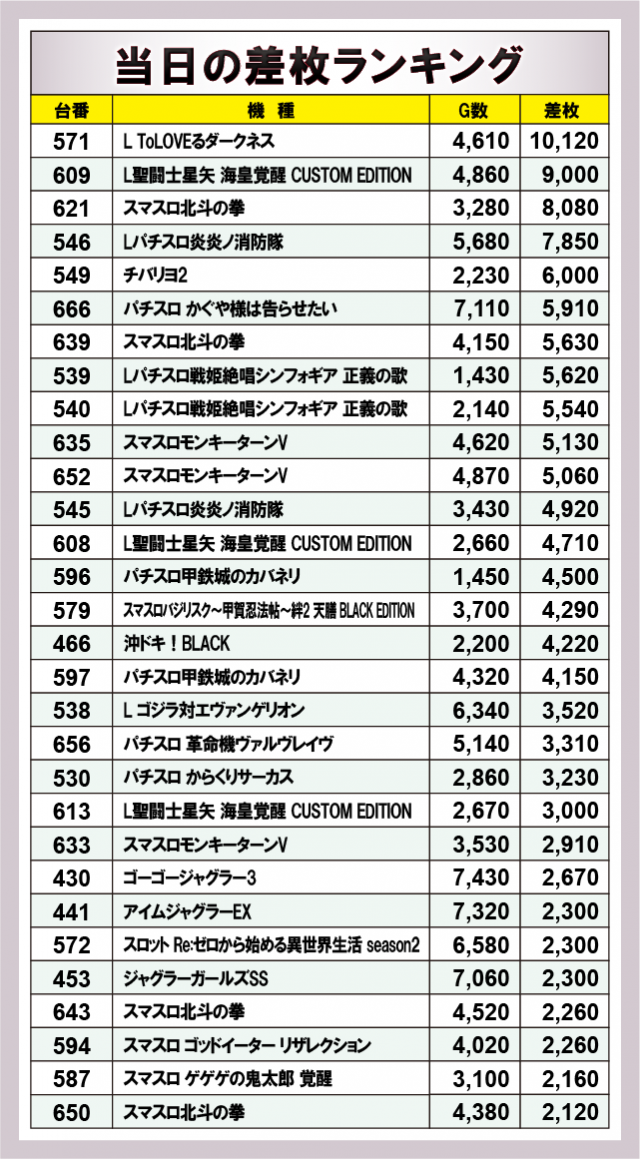 『L ToLOVEるダークネス』から万枚OVERが飛び出しており、さらに『L聖闘士星矢 海皇覚醒 CUSTOM EDITION』が9,000枚OVERで続いている。ほかにも大台突破台を多く確認でき、遊技していたファンは高い熱気に興奮していたことだろう。
