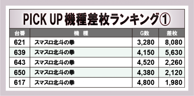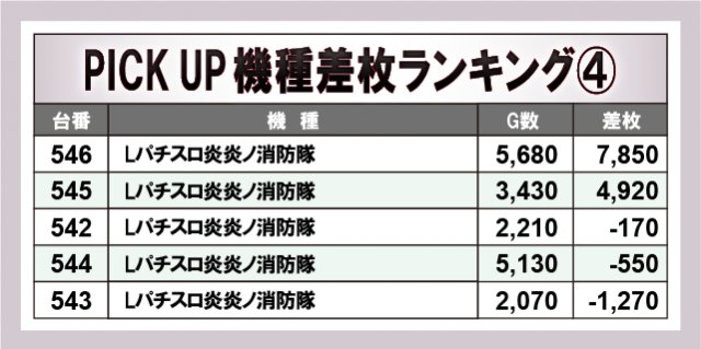 上表で取り上げている5機種は、いずれも大きな熱気を生み出している。『スマスロ北斗の拳』『スマスロモンキーターンV』『L聖闘士星矢 海皇覚醒 CUSTOM EDITION』『Lパチスロ炎炎ノ消防隊』は人気機種ならではの、さすがのひと言に尽きるパフォーマンスを披露。スマスロ機はもちろん、6.5号機不動の人気機種『パチスロ甲鉄城のカバネリ』では全台4,000枚OVERを記録。店内全体が活気にも満ちていたことから、しっかりと期待に応えていたと言えるだろう。