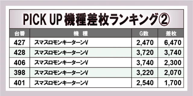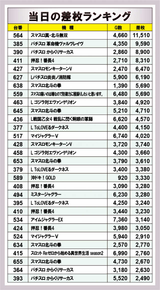 上表の5機種から多くの台が可能性を秘めていたと分かる。スマスロ機・メダル機ともに4桁プラス台が多数存在し、大きく盛り上がっていた様子だ。