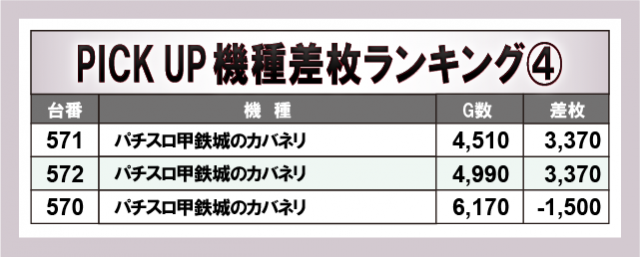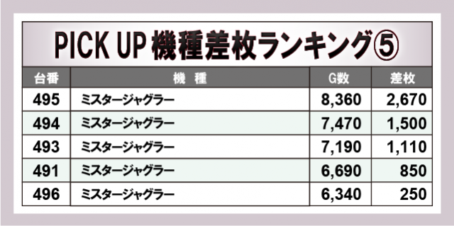 上表に取り上げた5機種は、いずれも店内を包み込む熱気を形成した機種と言える。『押忍!番長4』『L ゴジラ対エヴァンゲリオン』といった人気スマスロ機からまとまった出玉が目立つばかりか、『マイジャグラーⅤ』『パチスロ甲鉄城のカバネリ』『ミスタージャグラー』といったメダル機も負けず劣らず、プラス4桁台を多数発生させており、ファンは競い合うようにレバーを叩いていたと言えるだろう。