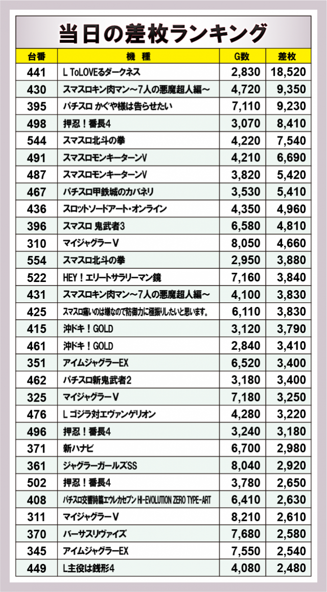 ※差枚数順に掲載しています。