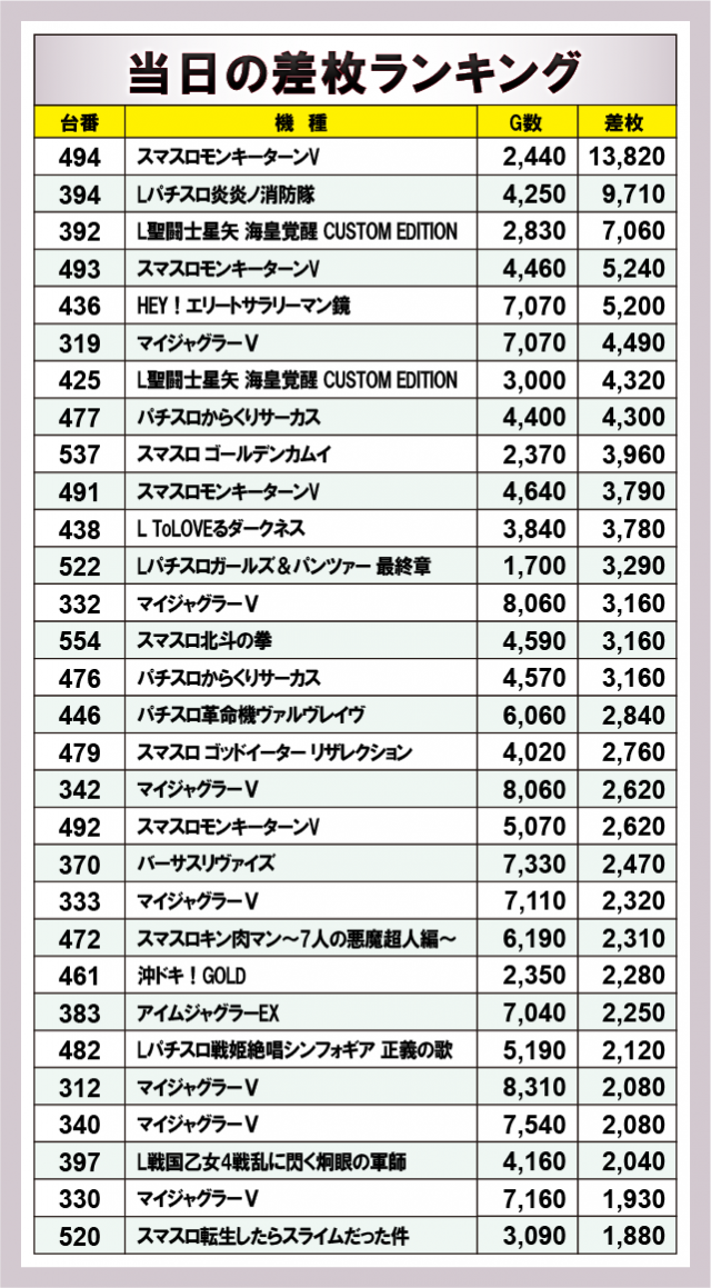 ※差枚数順に掲載しています。