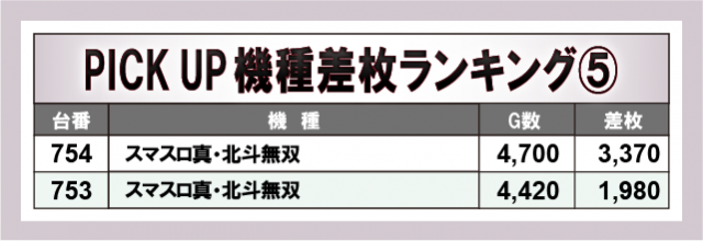 注目機種は上記の5機種。それぞれプラス4桁差枚を記録した台があり、その存在感をホール中に示していた。さらに、『パチスロ甲鉄城のカバネリ』『ゴーゴージャグラー3』『スマスロ真・北斗無双』では全台プラス差枚を記録! 圧倒的な熱量でホールを盛り上げていた。