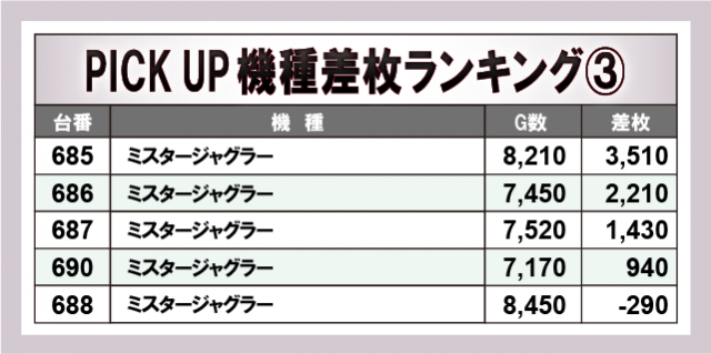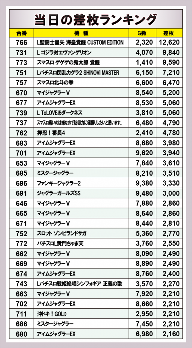 『L聖闘士星矢 海皇覚醒 CUSTOM EDITION』から万枚OVERが生まれている。これに続いて『L ゴジラ対エヴァンゲリオン』『スマスロ ゲゲゲの鬼太郎 覚醒』で9千枚OVER、『Lパチスロ閃乱カグラ2 SHINOVI MASTER』で7千枚OVERをマーク!更に『マイジャグラーⅤ』『アイムジャグラーEX』の5千枚OVERを筆頭に『ジャグラー』シリーズが多数ランクインするなど、各所で打ちごたえのある状況が整っていたことが窺える。