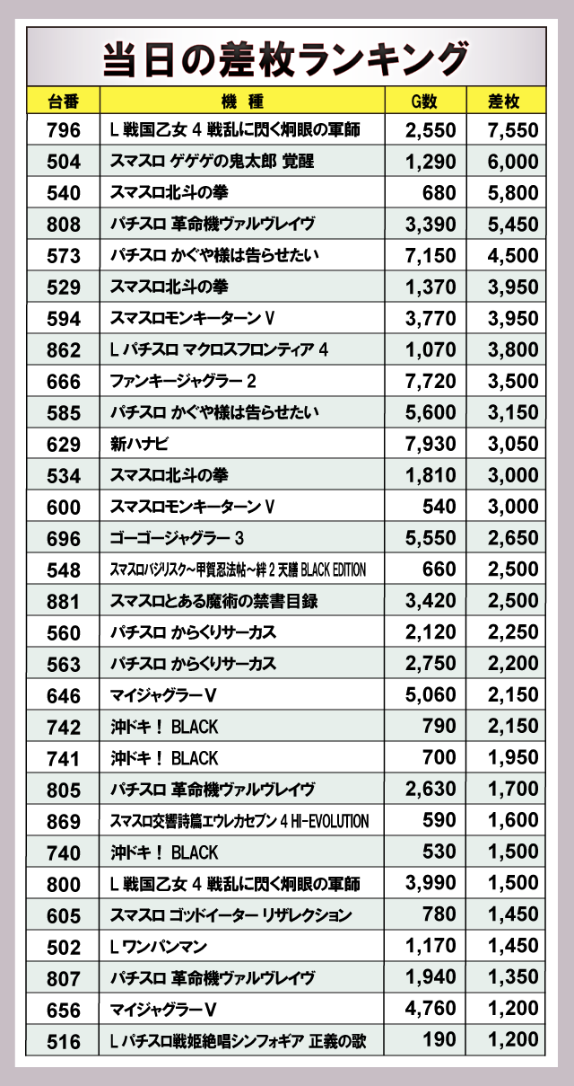 ※差枚数順に掲載しています。