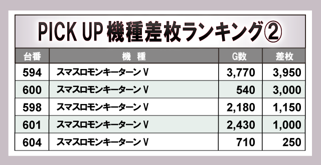 上表の4機種から多くの台が可能性を秘めていたと分かる。スマスロ機・メダル機ともに4桁プラス台が多数存在し、大きく盛り上がっていた様子だ。