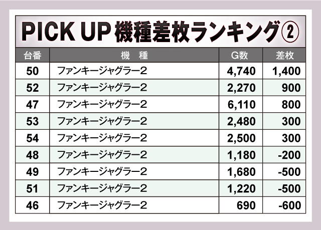 機種別に見てみると、こちらでもジャグラーシリーズの優秀さが際立っており、『マイジャグラーV』では+3,000枚OVERが2台。『ファンキージャグラー2』でもプラス4桁差枚を記録するなど、ホール内で注目を集めていた。