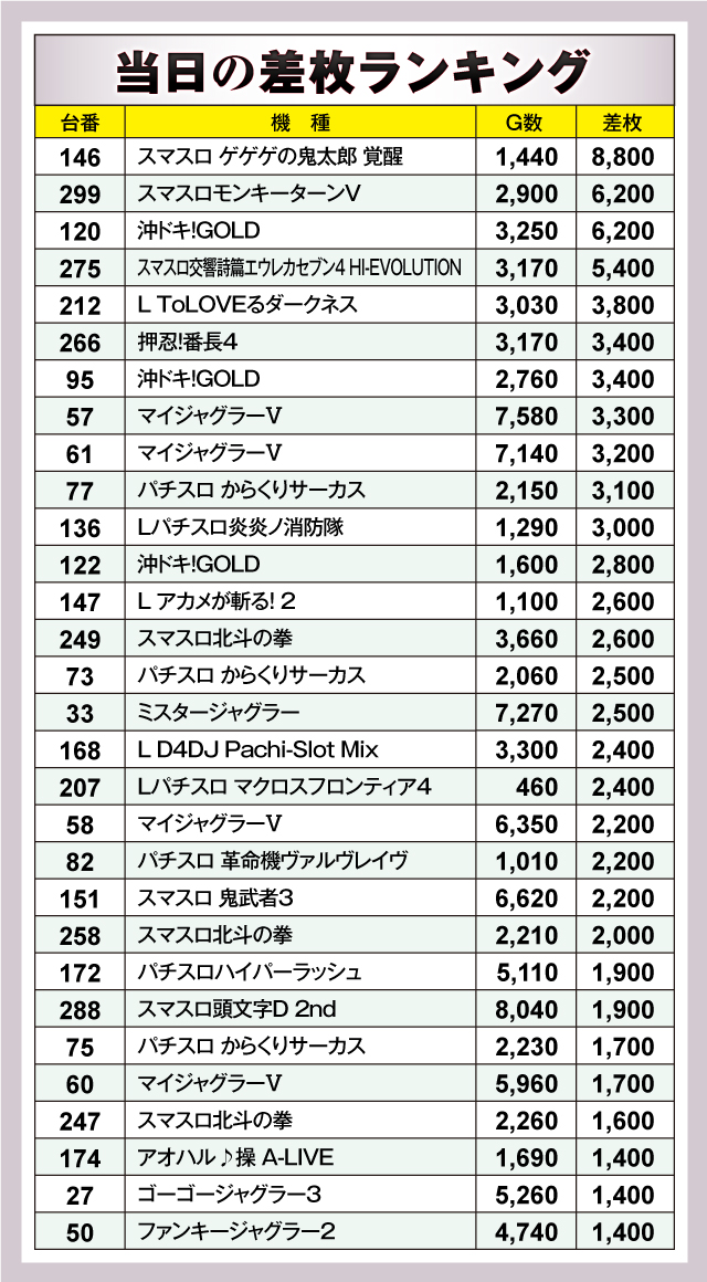 まずは当日の差枚ランキングのチェックから。30台のうち22台が+2,000枚オーバーを記録していたが、その中でトップに立ったのは146番台の「スマスロ ゲゲゲの鬼太郎 覚醒」で、差枚は+8,800枚と万枚まであと一歩という記録に。また、スマスロはもちろんだが、ジャグラーシリーズも多数ランクインしており、幅広くさまざまな機種にチャンスが存在していたことが窺える。