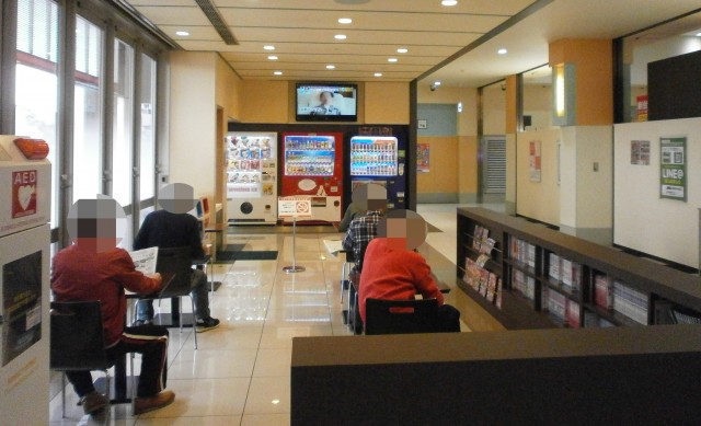 無料で使える携帯電話の充電器や漫画本といった設備面も優れている「ABC磐田中泉店」。有意義な時間を過ごせるといったイメージの素敵なホールであった。