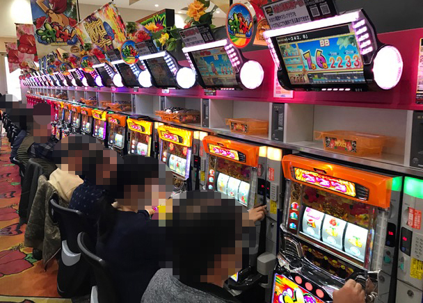 多彩な機種構成も魅力的な5円パチスロも人気。笑みを浮かべて遊技をおこなっているプレイヤーたちの姿が印象に残っている。