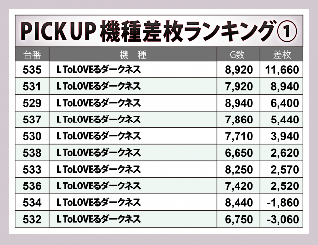 導入間もない『L ToLOVEるダークネス』ではプレイヤーの勝利となった台が多数。8台が4桁以上のプラスを残した上、+11,700枚弱を皮切りに+8,900枚超・+6,400枚超・+5,400枚超・+3,900枚超が1台ずつと、店内随一となる大きな盛り上がりを迎えた。