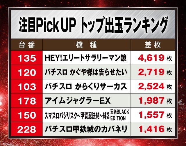また、その他の機種では『アイムジャグラーEX』や『スマスロバジリスク~甲賀忍法帖~絆2天膳 BLACK EDITION』が奮闘しておりランキング上位に登場、人気機種を中心に至るところで盛り上がりを見せていた。