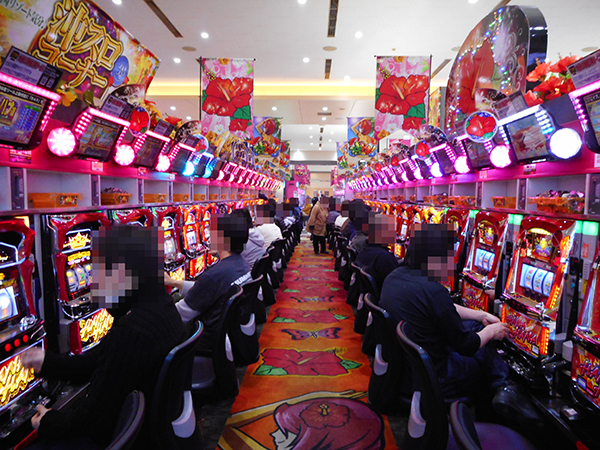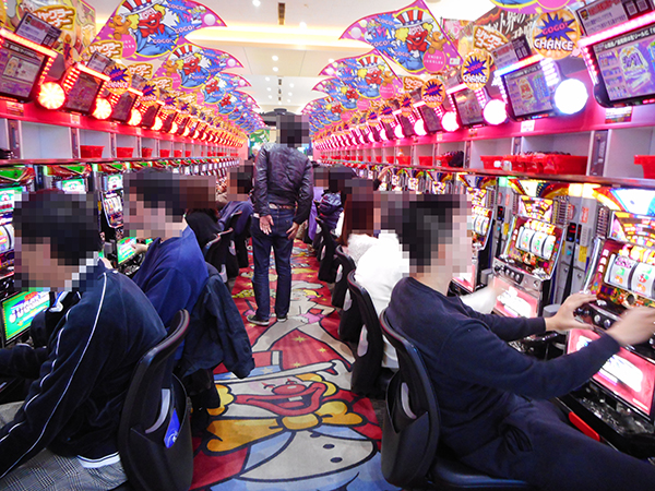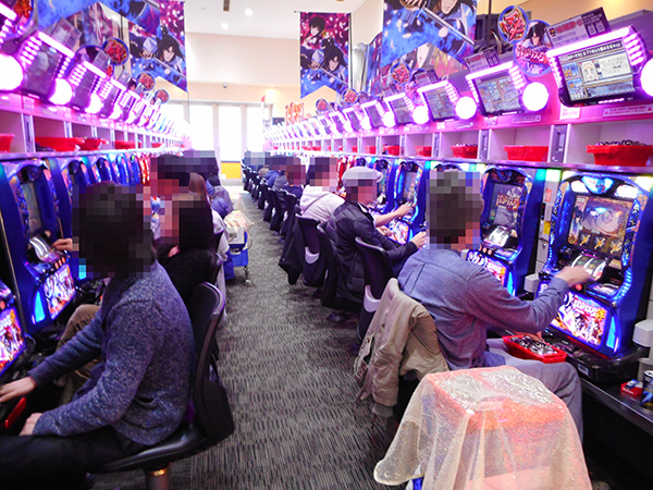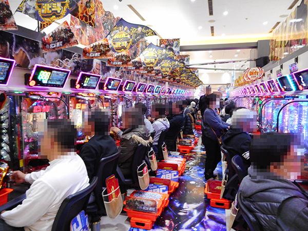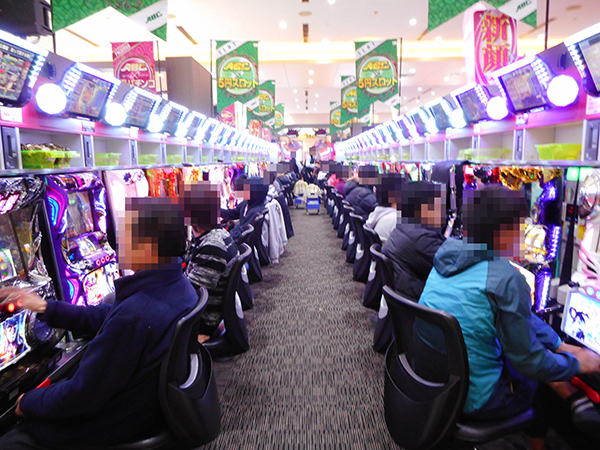 5円パチスロコーナーも大勢の熱気に包まれていた。