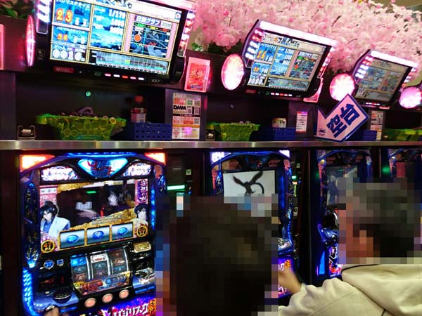 20円パチスロを見てみると、「バジリスク~甲賀忍法帖~絆」コーナーに桜の装飾が施され、華やかな雰囲気となっていた。活躍するプレイヤーも多く、シマ全体が大きく盛り上がっていた。