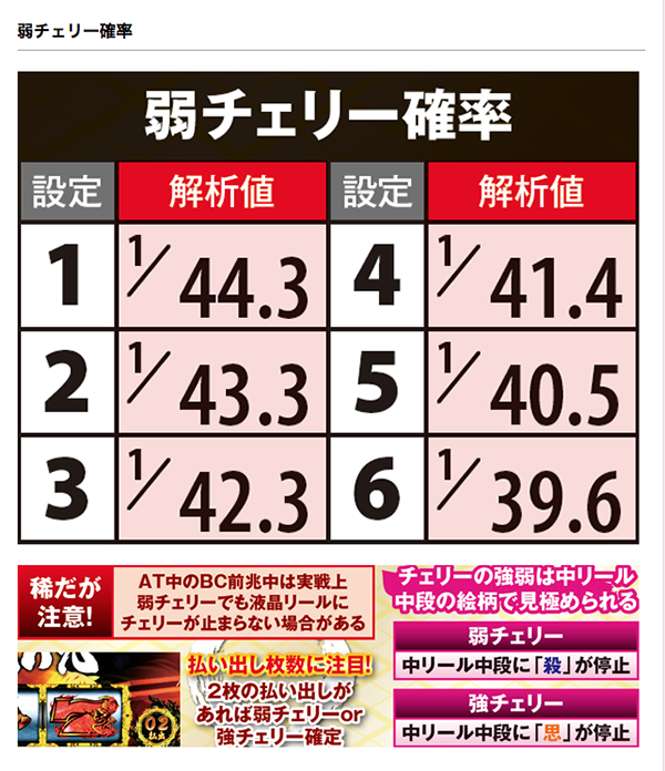 また、中リール中段に「殺」が停止する弱チェリー確率にも設定が設けられているため、しっかりとカウントし、設定推測の精度を高めたい。