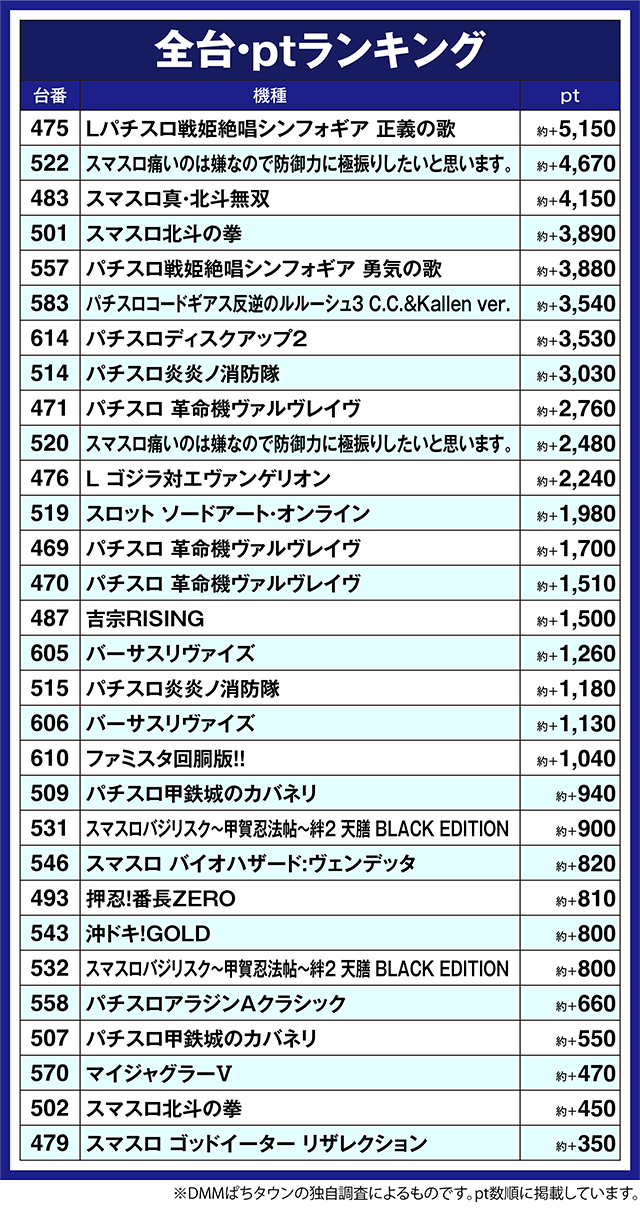 ほかにも、「パチスロディスクアップ2」の614番台や「L ゴジラ対エヴァンゲリオン」の476番台などが約+2,000pt以上となった。